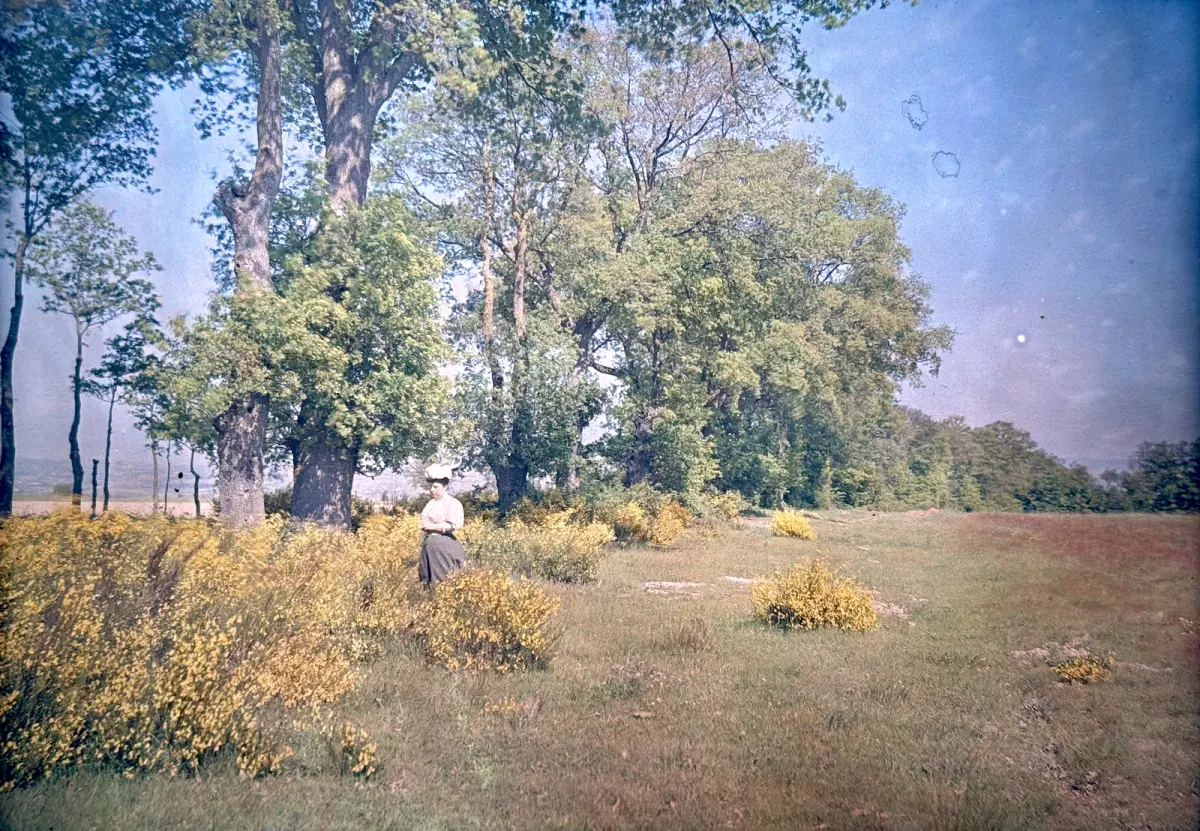 Très bel autochrome Lumière d'une femme élégante au bord d'une clairière au milieu des genets.