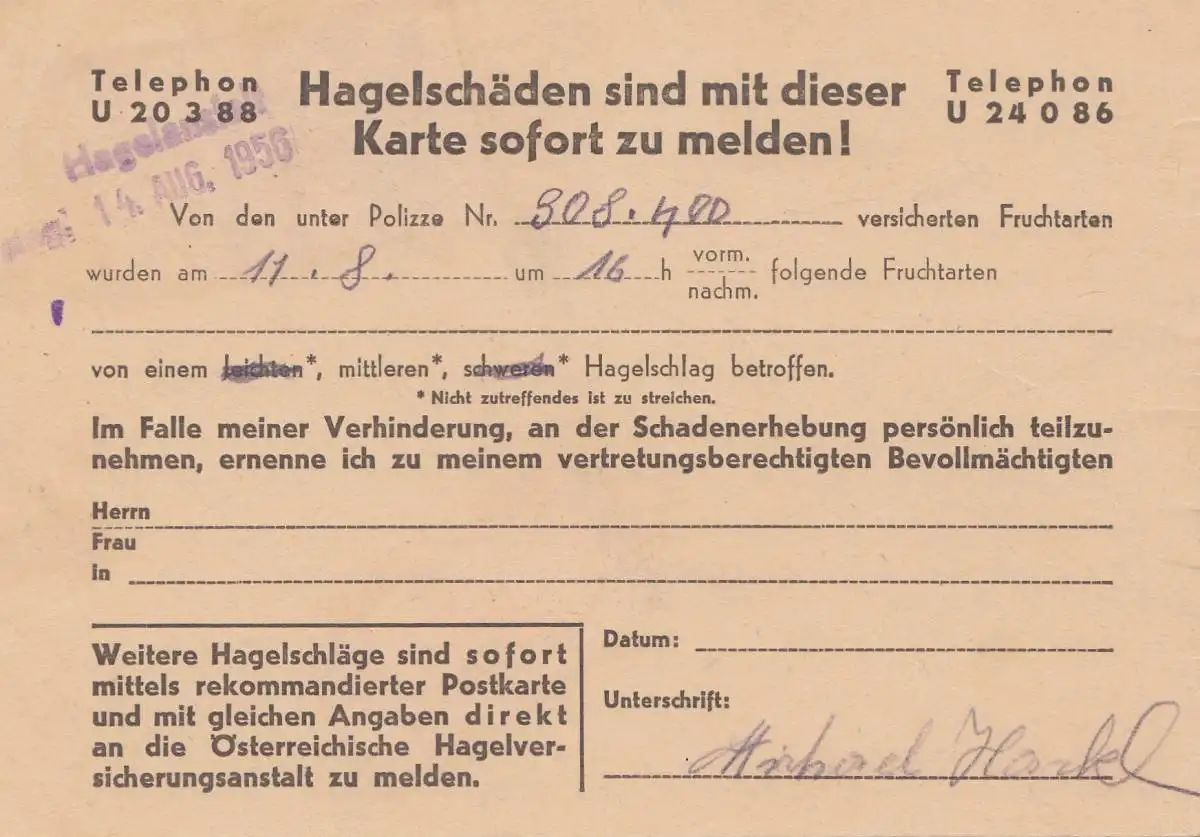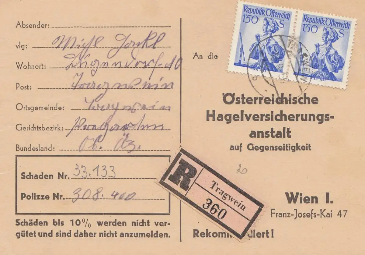 Autriche: 1956: vin de porte, carte recommandée pour dommages à la grêle