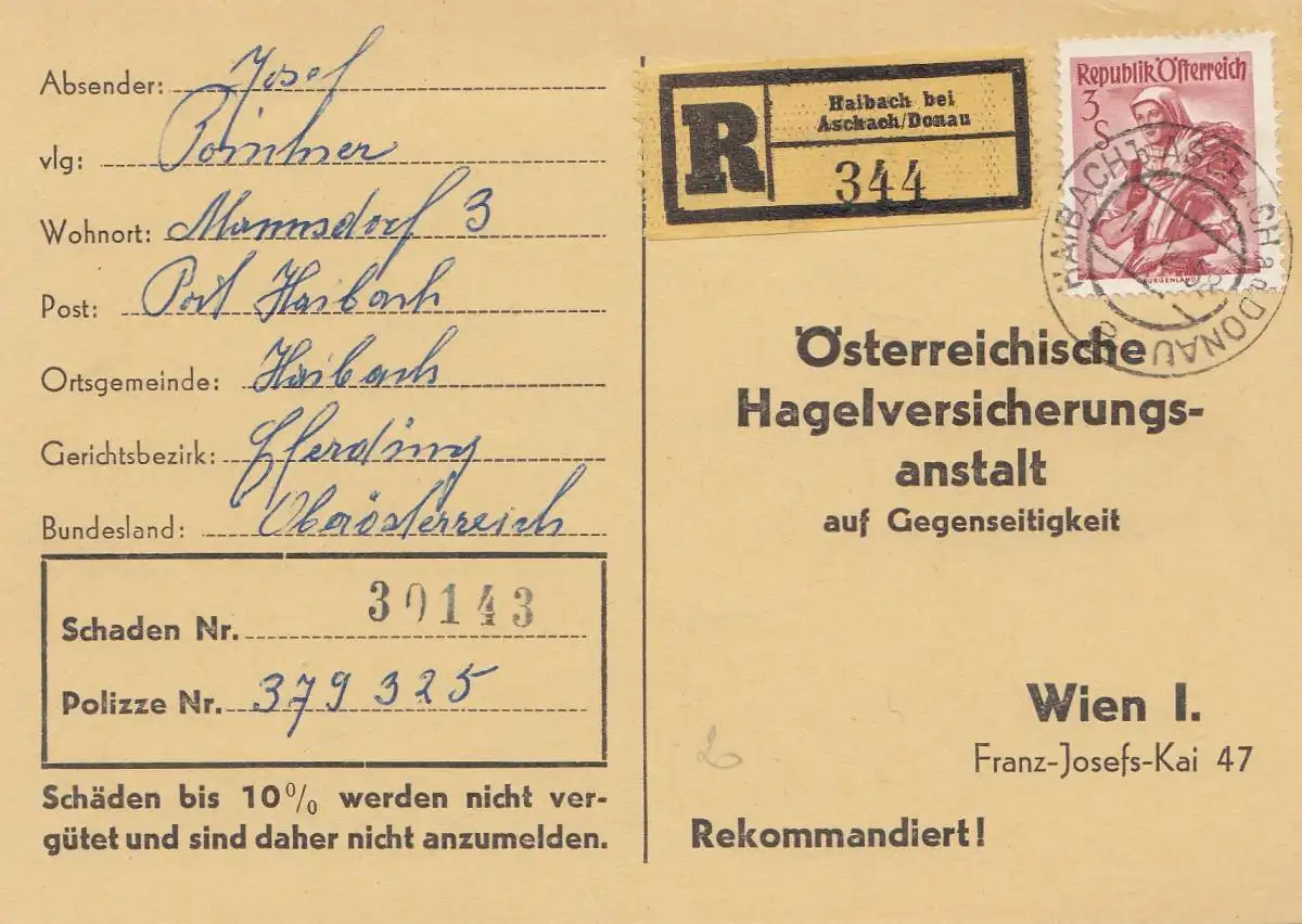 Autriche: 1958: Haibach vers Vienne- Hagelversicherung