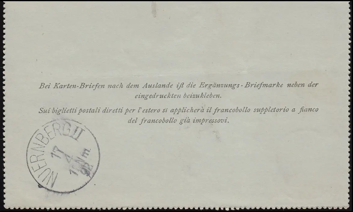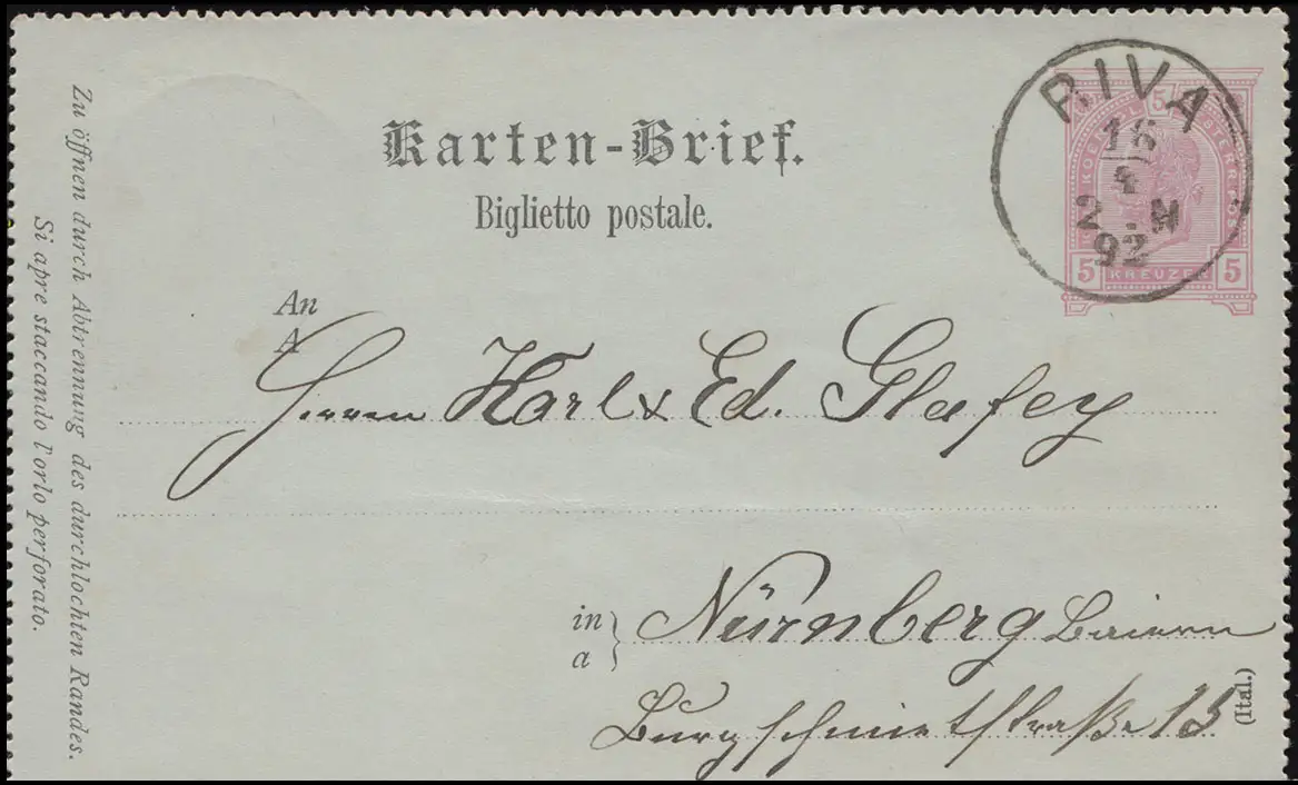 Autriche Carte de crédit K 24 RIVA 16.4.1892 vers NÜRNBERG II 17.4.92