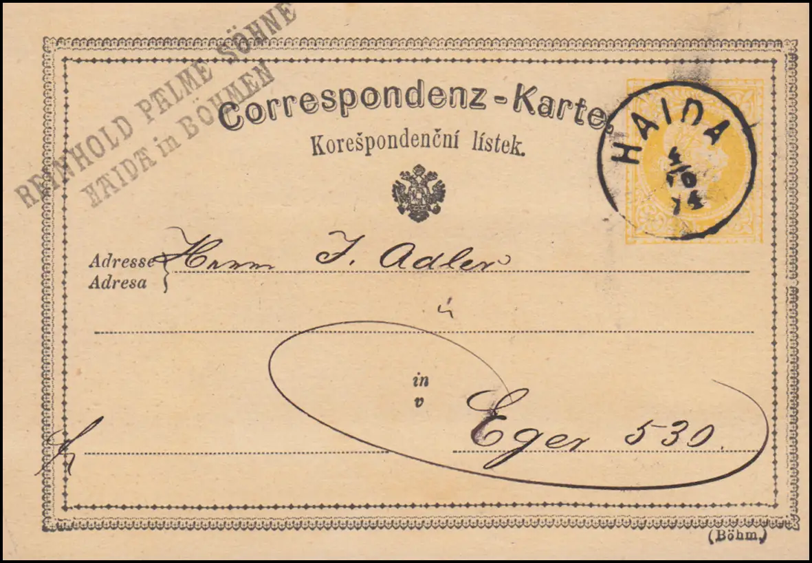 Autriche Carte postale P 18a Bohême de HAIDA 4.10.1874 vers Eger