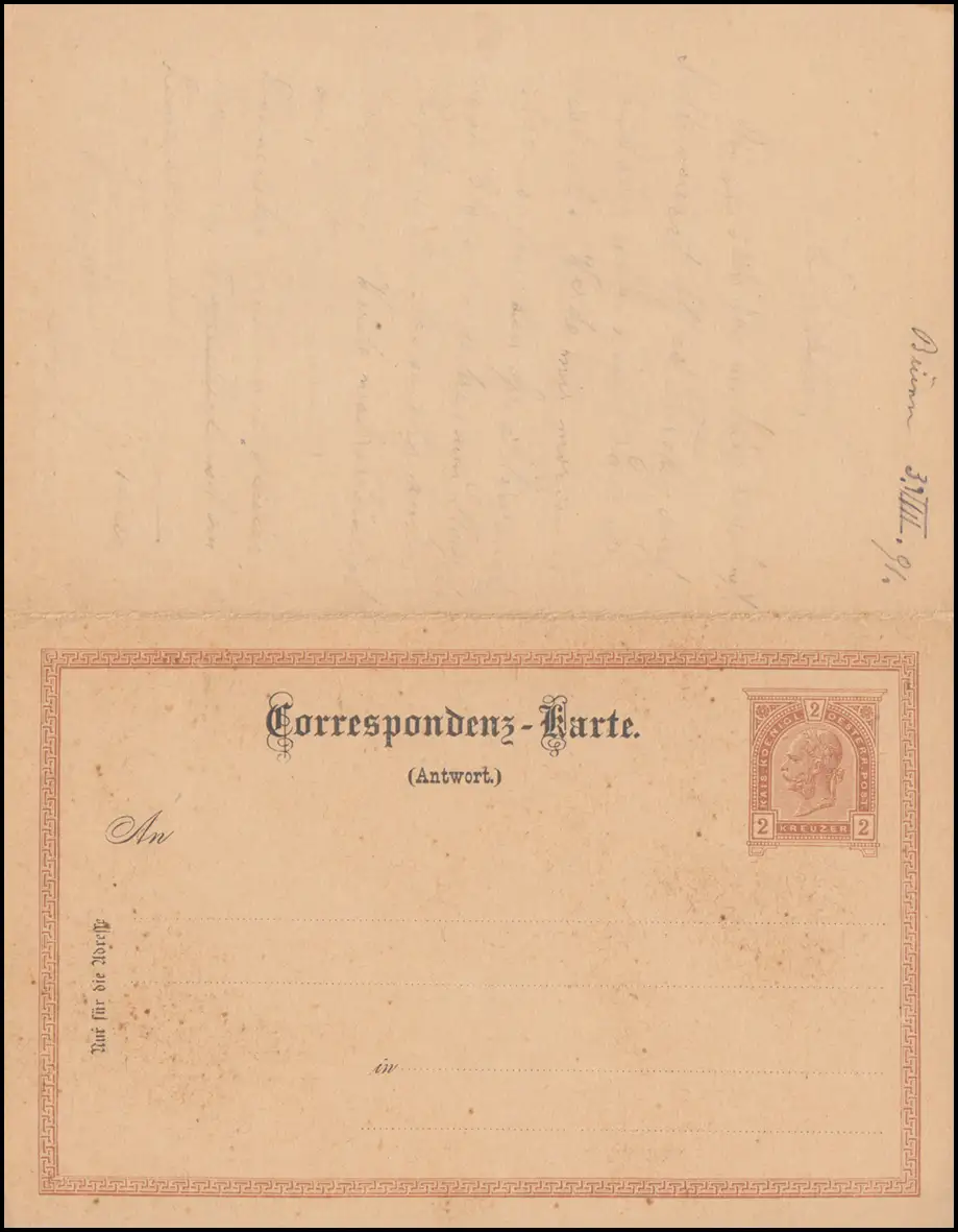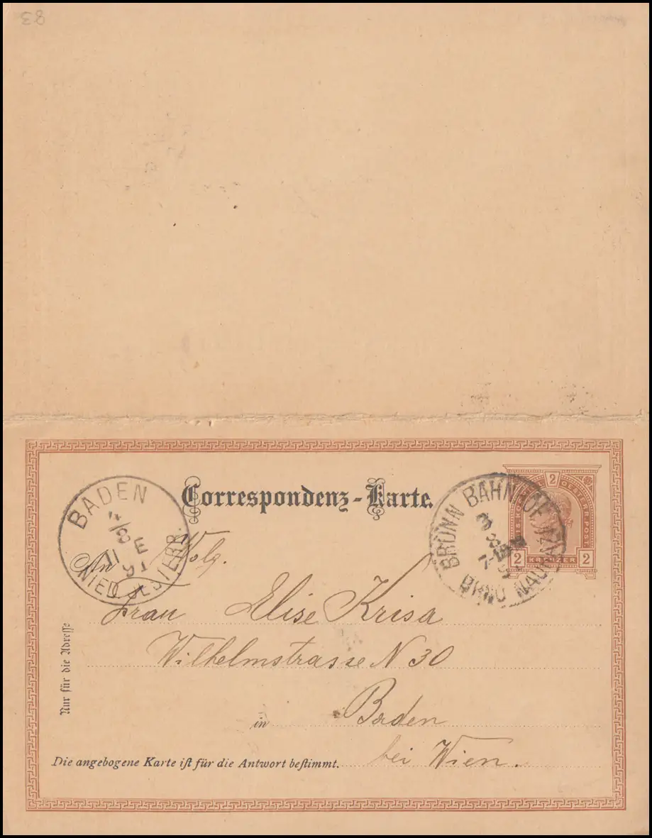 Autriche Carte postale P 83 F/A de BRÜNN BAHNHOF 3.8.1891 vers BADEN/Vienne 4.8.91