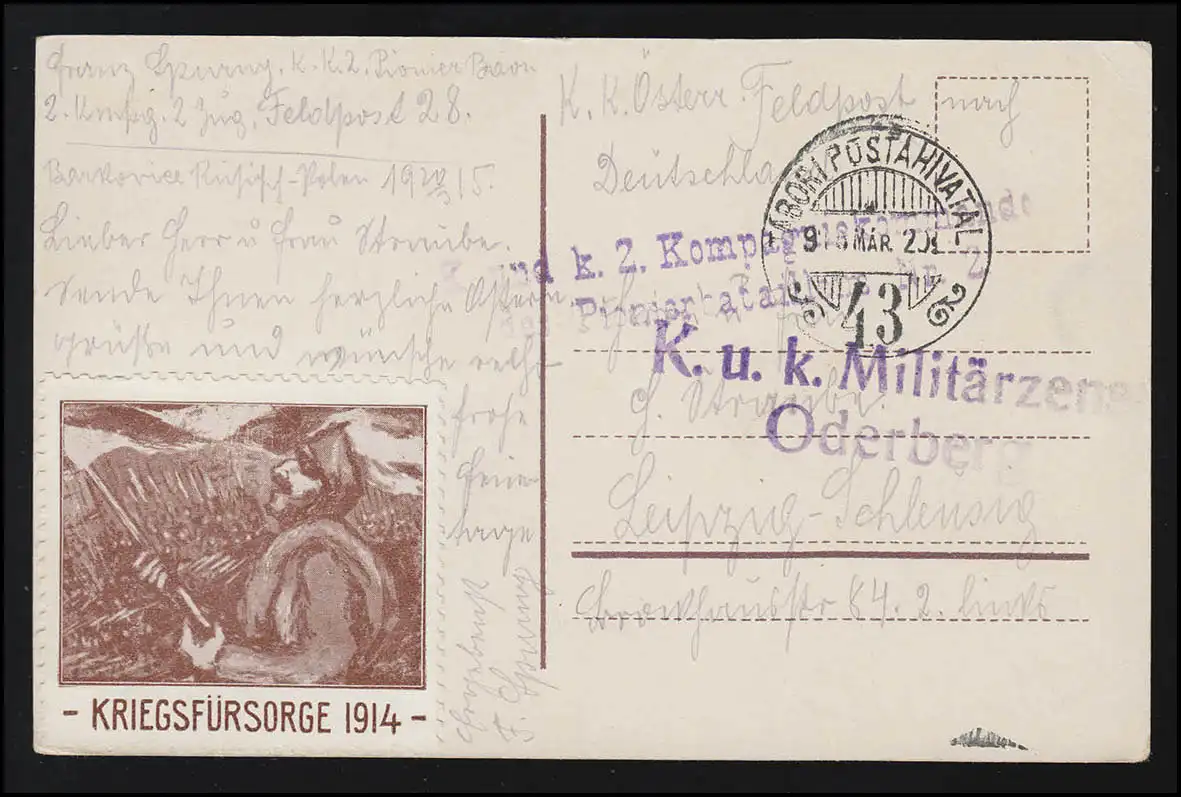 avec marque de distributeur "KRIEGSPRUSORGE 1914," Militairezensur Oderberg, après Leipzig Examen: original Référence d'article: 00000000048335