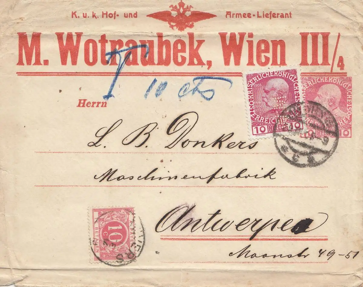 Autriche: Vienne, porcs Grande-Schlütterei à Anvers, supplément, Perfin