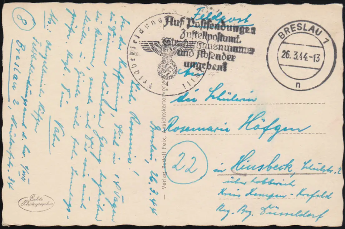 Tampon quotidien BRESLAU 1 - 26.3.44 sur carte d'affichage Sudetenland Schwarzenberg-Johannisbad dans les Monts des Géants Test: original Référence produit: 00000000022267>p>Note: Cet article n'est disponible qu'une seule fois. Vous recevrez exactement l'article représenté.