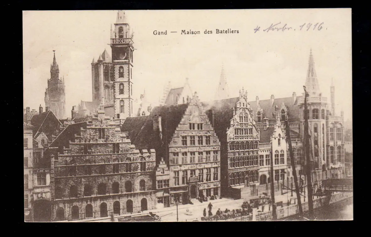 BS Soldatheim I Gand sur AK Ganda/Gand Maison des Bateliers, Feldpost 4 - 1916
