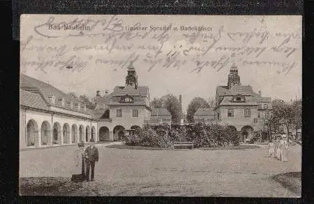 Bad Neuheim. Großer Sprudel und Badehäuser - Gebraucht. 1909. Wasserschaden Vorderseite von der Rückseite zum Teil abgetrennt. (NPLZ 61231)