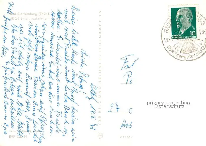 Bad_Blankenburg FDGB Erholungsheim am Markt Bad_Blankenburg postalisch gelaufen 1973 Erhaltung siehe scans [FriedD77] Frierer