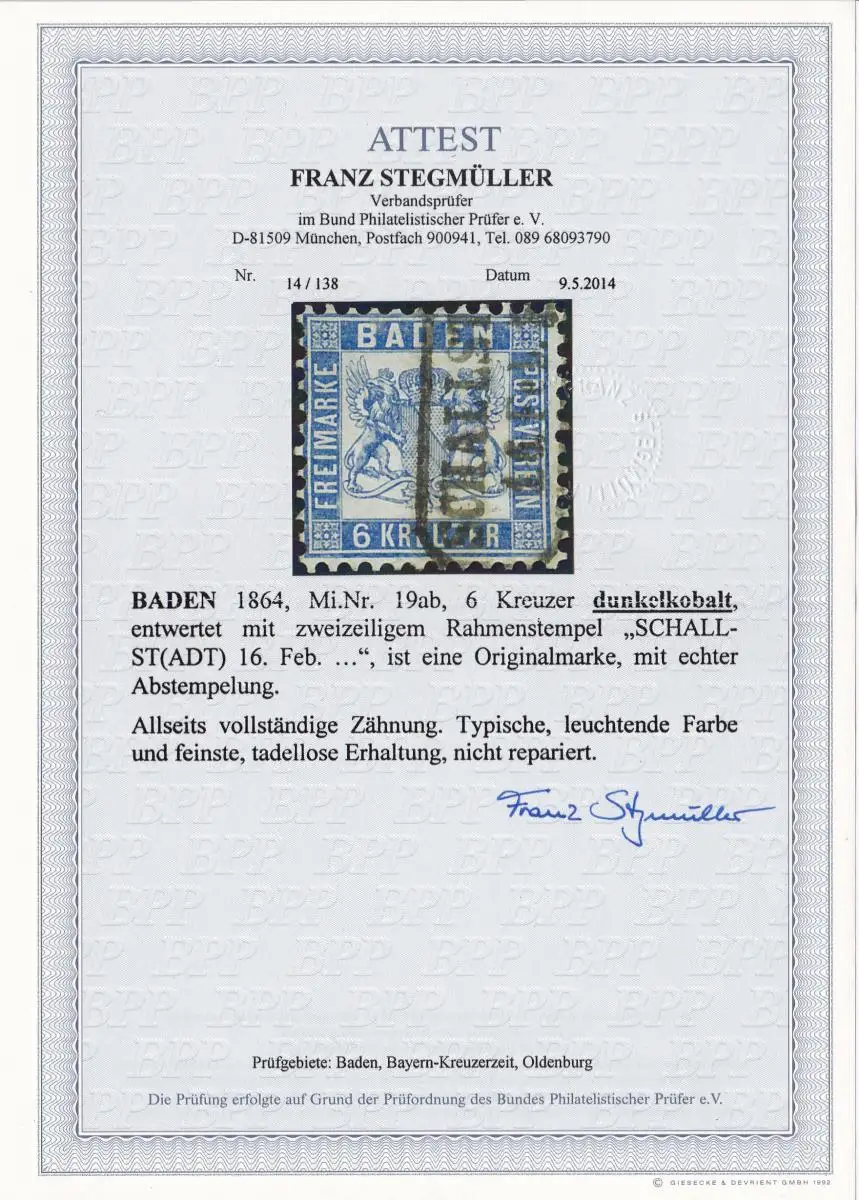 Baden: MiNr. 19ab, BPP Attest, marque tamponnée