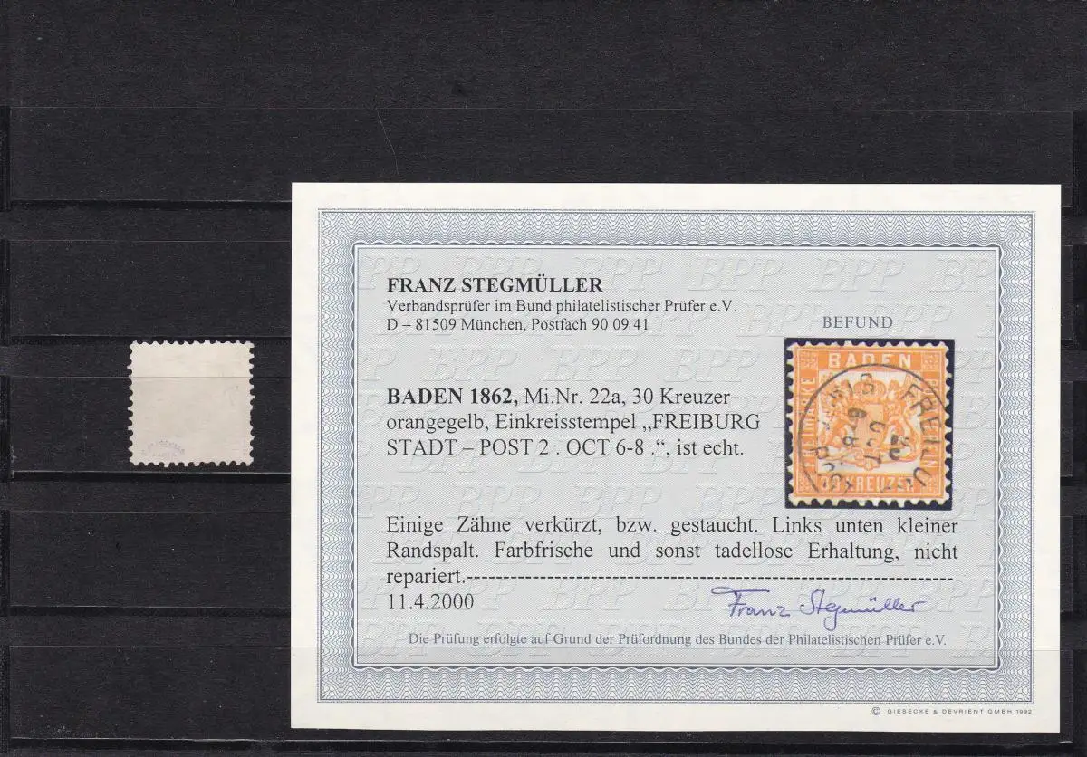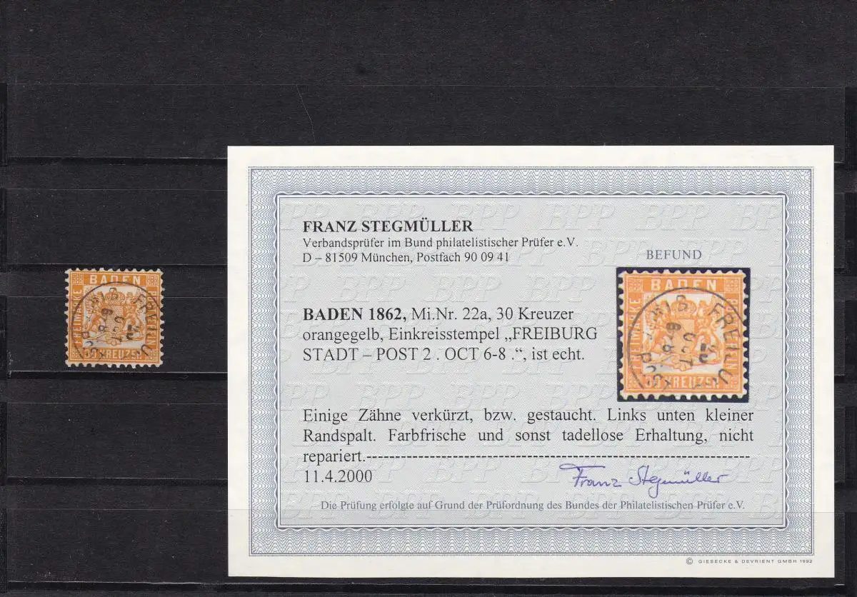 Baden: MiNr. 22a, cacheté Fribourg, BPP résultat