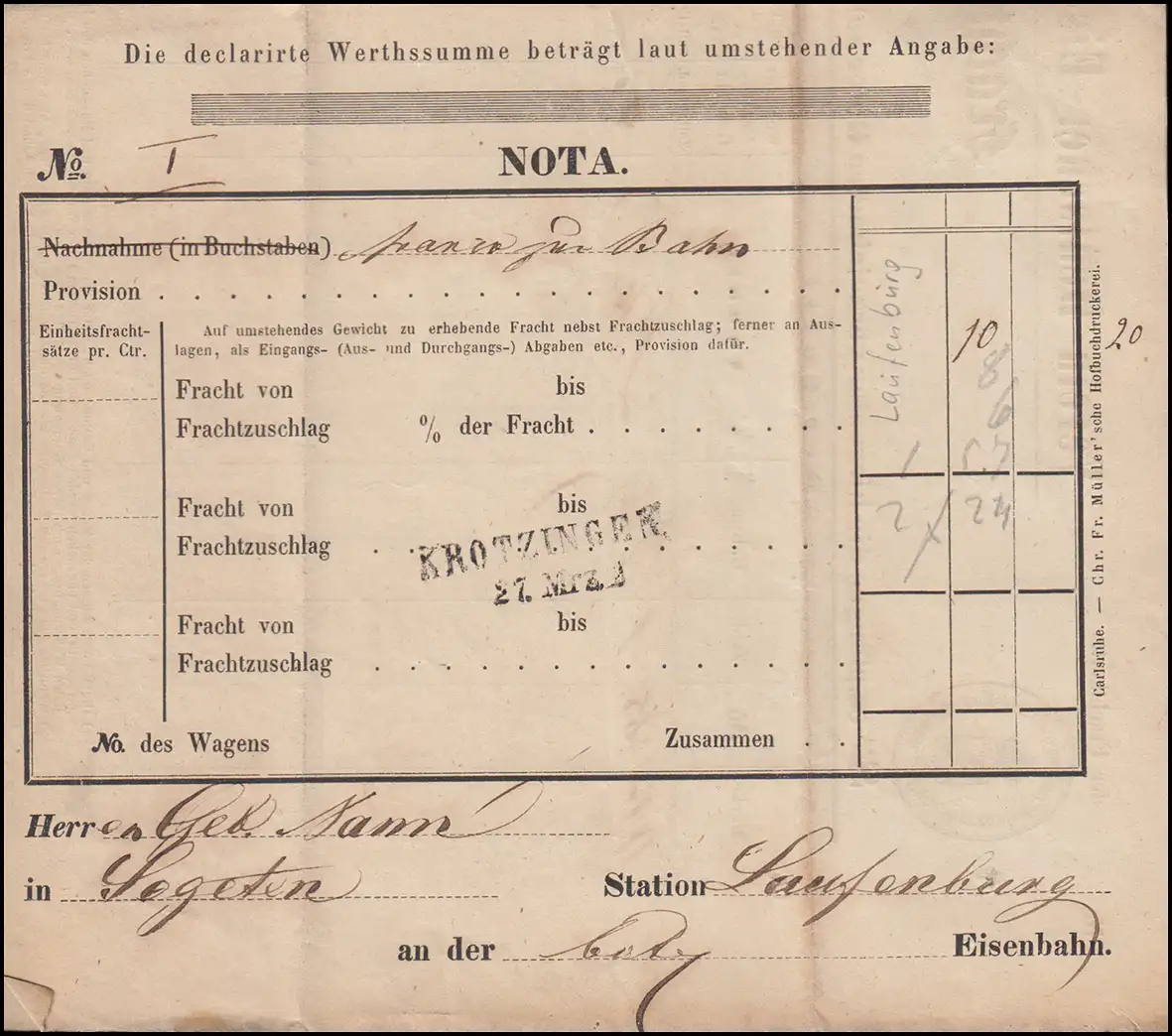 Station Lufenburg, arrivée Bizierler "KROTZINGEN 27 mars" examen: original Référence produit: 00000000034028