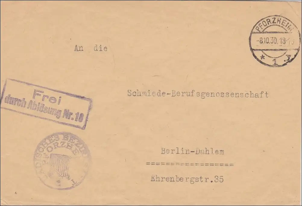 Badisches Verwaltung Pforzheim 1930 vers Berlin - Forgetung Berufsgenossenschaft