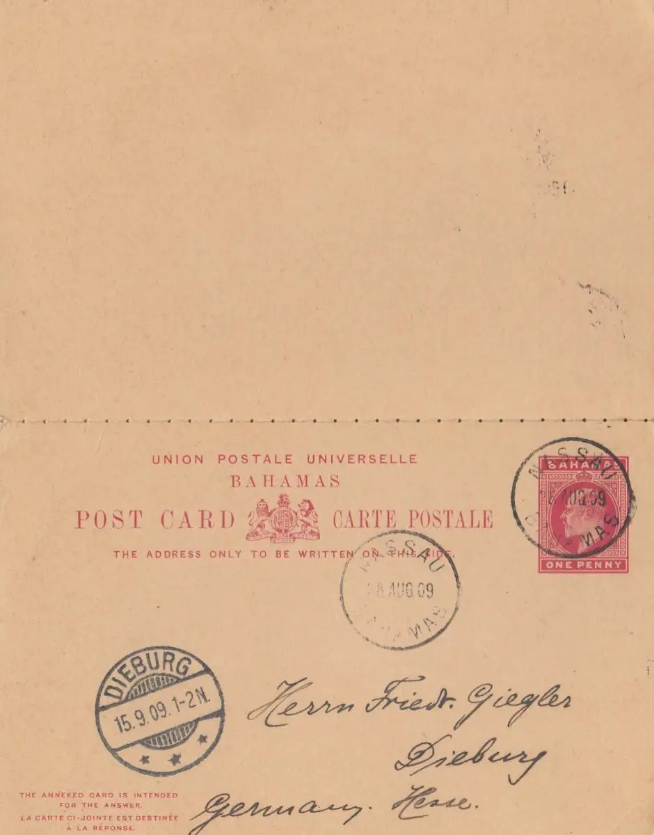 Bahamas: post card 1909: Nassau to Dieburg