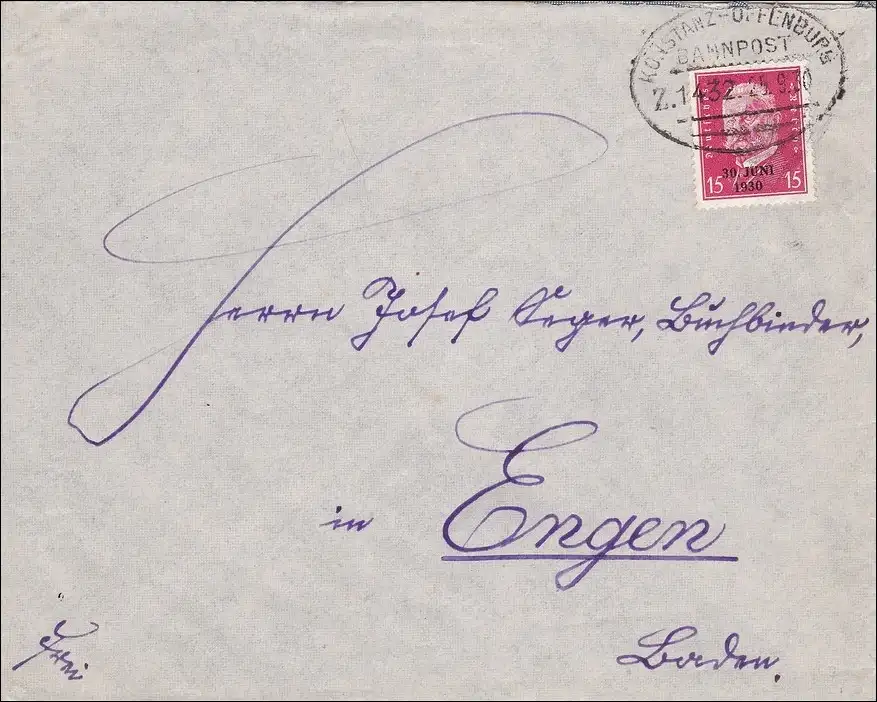 Poste ferroviaire: 1930 Lettre avec cachet de train de Constance-Offenburg