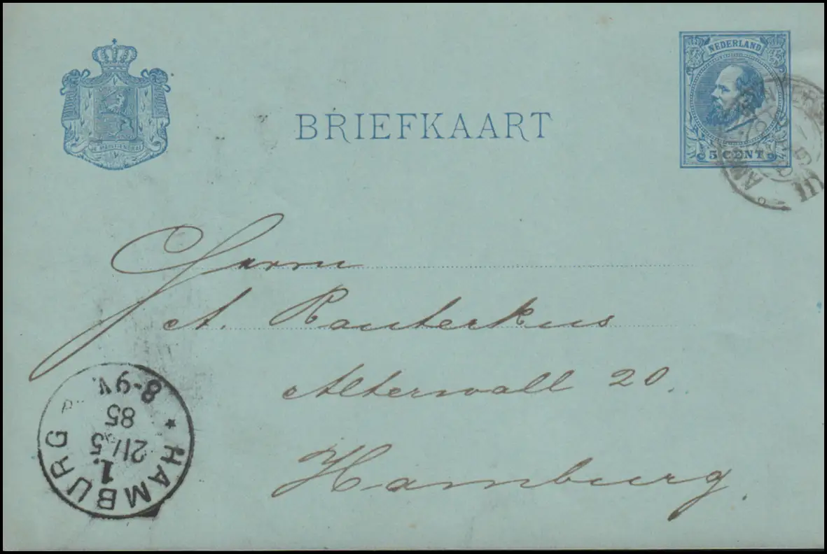 Poste ferroviaire Amsterdam-Winterswijk 20.5.1885 sur carte postale P 13 vers HAMBURG 21.5.85
