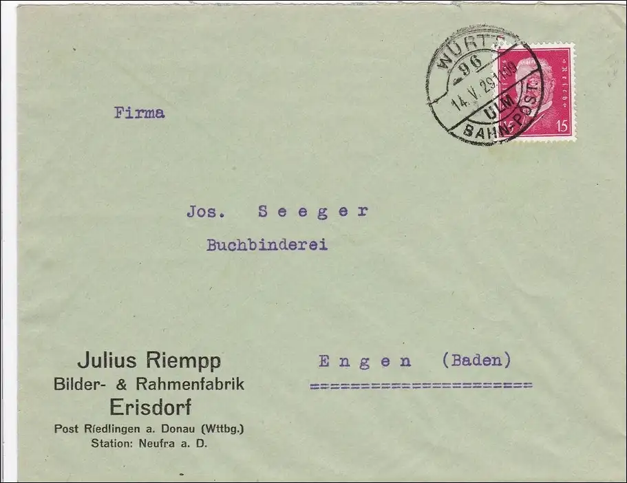 Poste ferroviaire: Lettre d'Erisdorf/Riedlingen avec poste ferroviaire cachet 1929