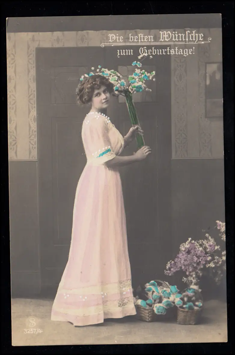 Carte d'affichage Félicitations Anniversaire: femme en robe rose avec fleurs Examen: original Référence produit: 00000000001561