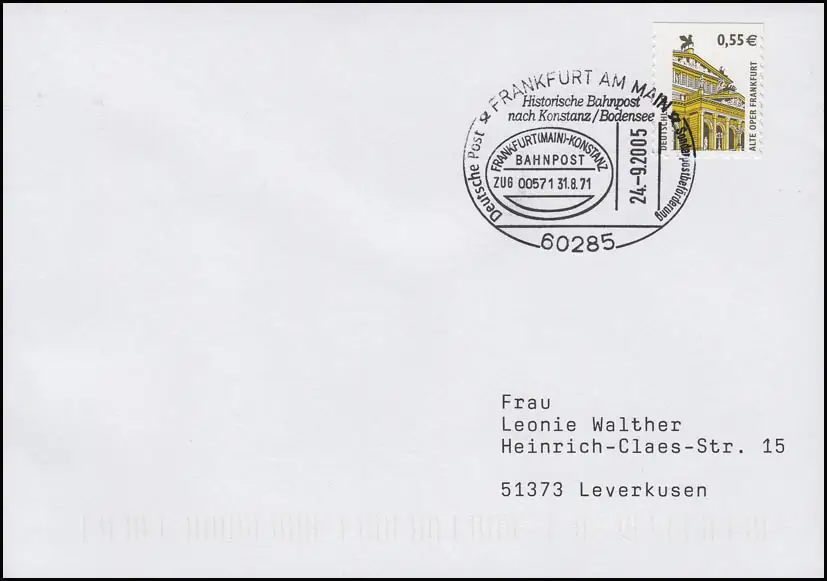 Bahnpost Frankfurt/Main - Konstanz/Bodensee, Brief SSt Frankfurt / Main 24.9.2005