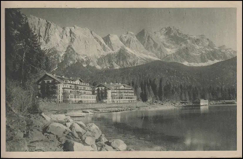 Carte de vue Hôtel et Pension Eibsee contre Zugspitze avec Francoterie mixte selon la figure par voie ferroviaire vers Arnheim / Holland. Examen: original Référence produit: 00000000032718