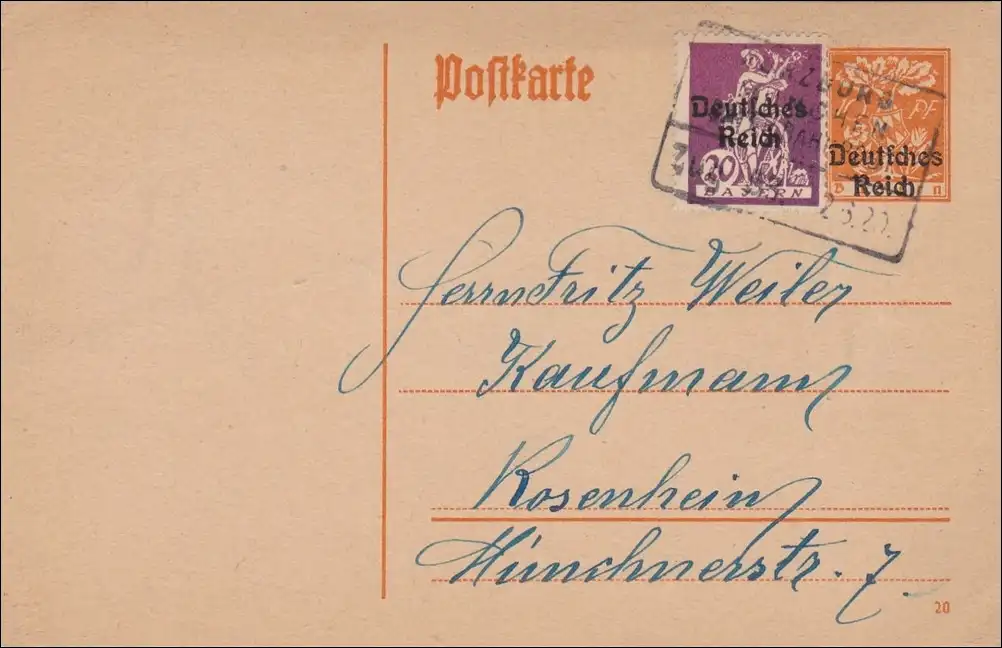 Poste ferroviaire: entier de Würzburg à Rosenheim 1920 avec cachet