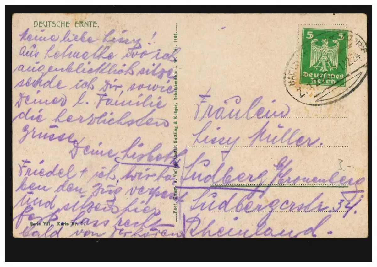 Post de chemin de fer HAGEN-BETZDORF ZUG 1257 - 21.12.1914 sur AK Récolte allemande