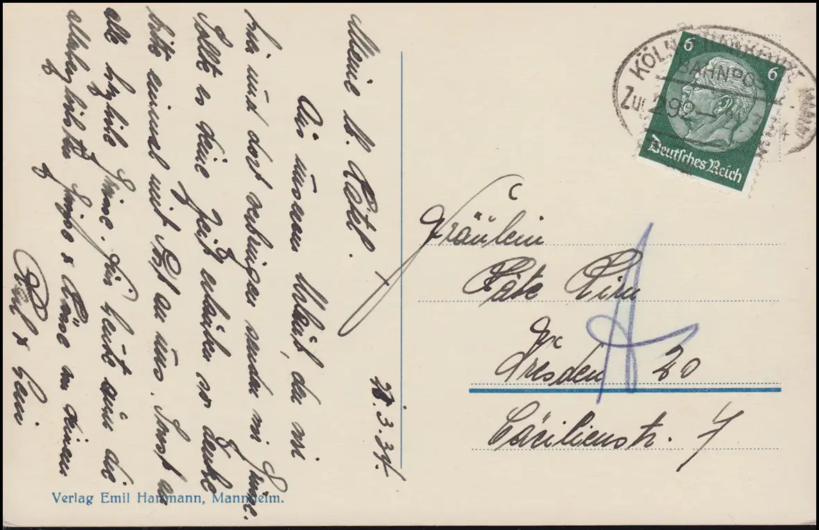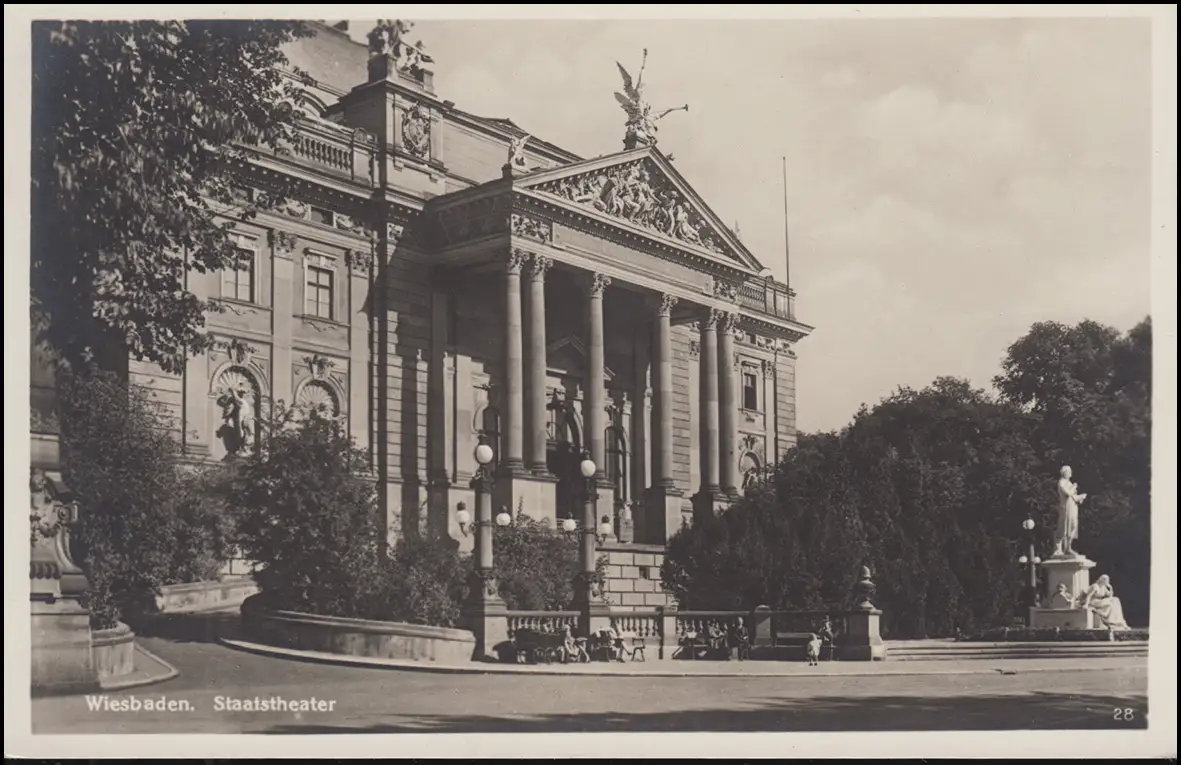 Poste ferroviaire KÖLN - FRANKFURT/MAIN ZUG 292 - 21.3.34 à AK Wiesbaden Théâtre d'Etat