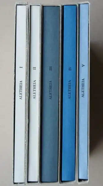 Volume I à volume V de la série de livre de photos Aletheia. Numérotés et signés par le photographe, chaque série est publiée dans une édition de 99 pièces. Format: 22 x 24 cm. Inserts cartonnés d'origine dans le tiroir en carton original. Très bonne conservation.