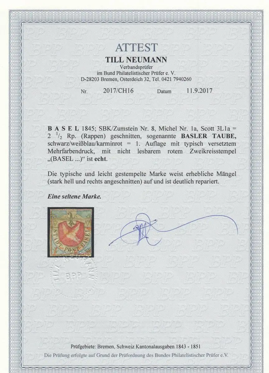 Bâle: MiNr. 1a, cacheté, BPP Battest - rare