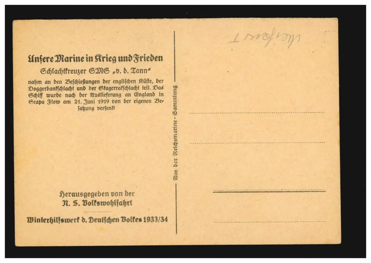 Série Notre Marine en guerre et paix / Aide d'hiver du peuple allemand 1933/34: Cruiseur de bataille SMS "de la Tann" coulé le 21 juin 1919 par son propre équipage Test: original Référence produit: 00000000042265>Remarque: Cet article n'est disponible qu'une seule fois. Vous recevrez exactement l'article représenté.