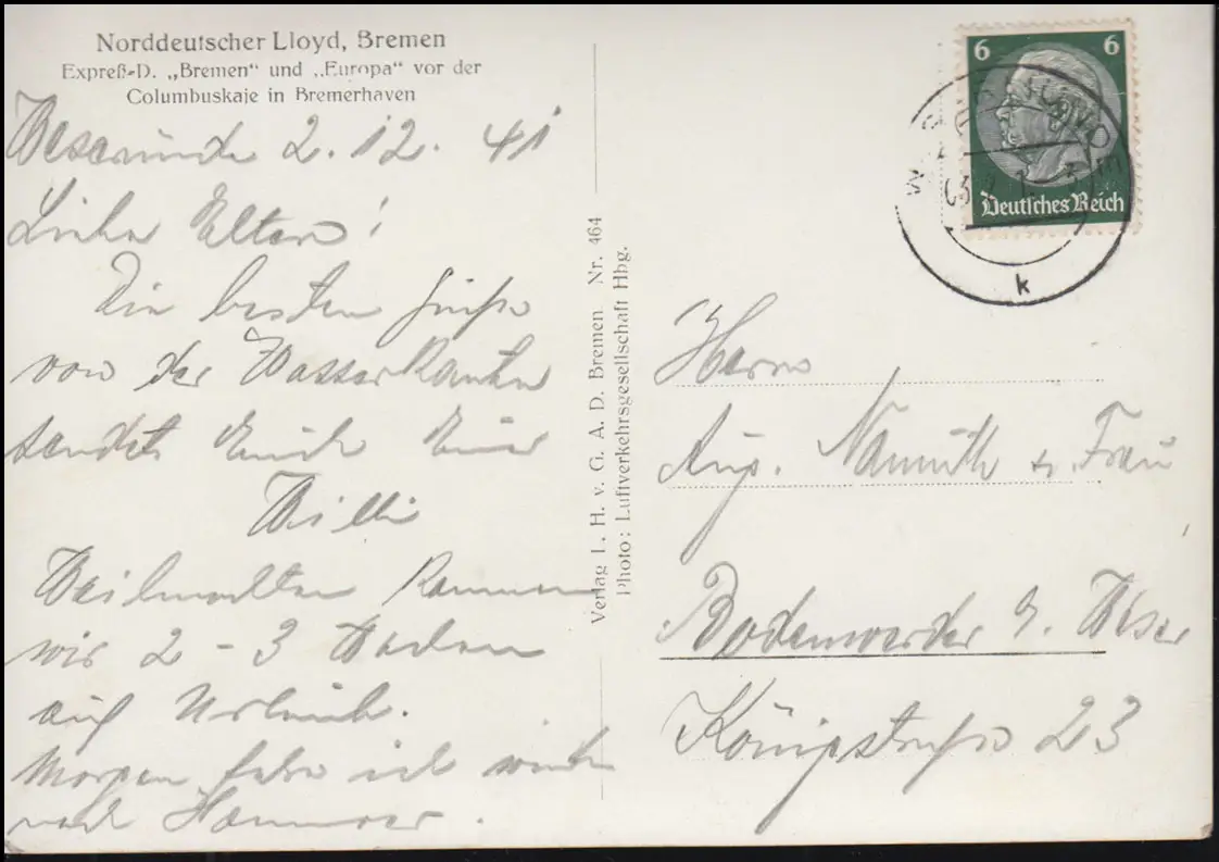 Carte de vue Lloyd, Brême: Express-Dampfer "Bremen" et "Europe" devant la Columbuskaie à Bremerhaven, WESERMÜNDE 3.12.41 Vérification: original Référence produit: 00000000042154>Remarque: Cet article n'est disponible qu'une seule fois. Vous recevrez exactement l'article représenté.