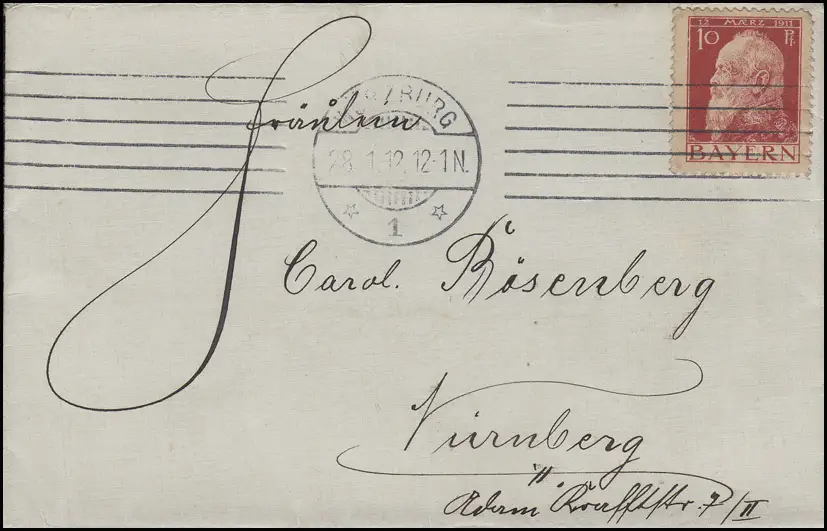 Bavière: 10 Pf Luitpold EF Bf WÜRZBURG 1. 28.1.12 vers Nuremberg Posttributeur-O 95