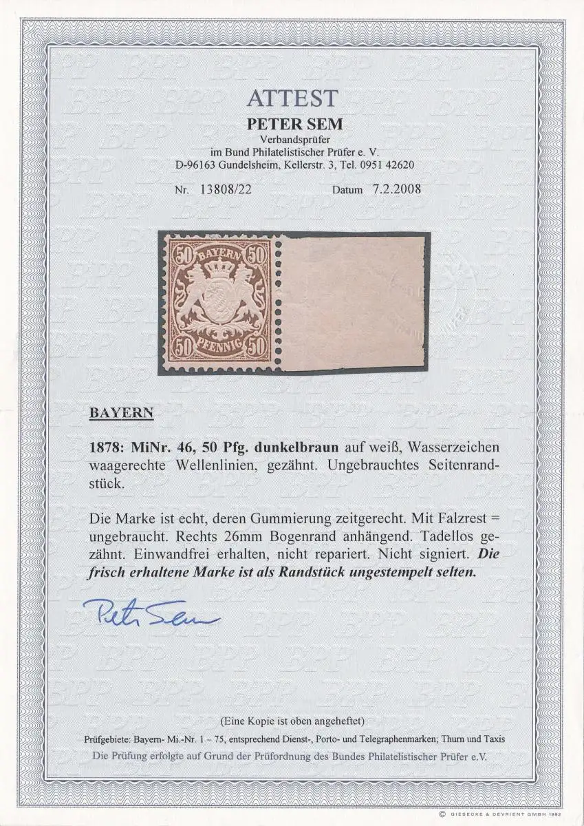 Bavière: MiNr. 46 der Rand, *, BPP Attest