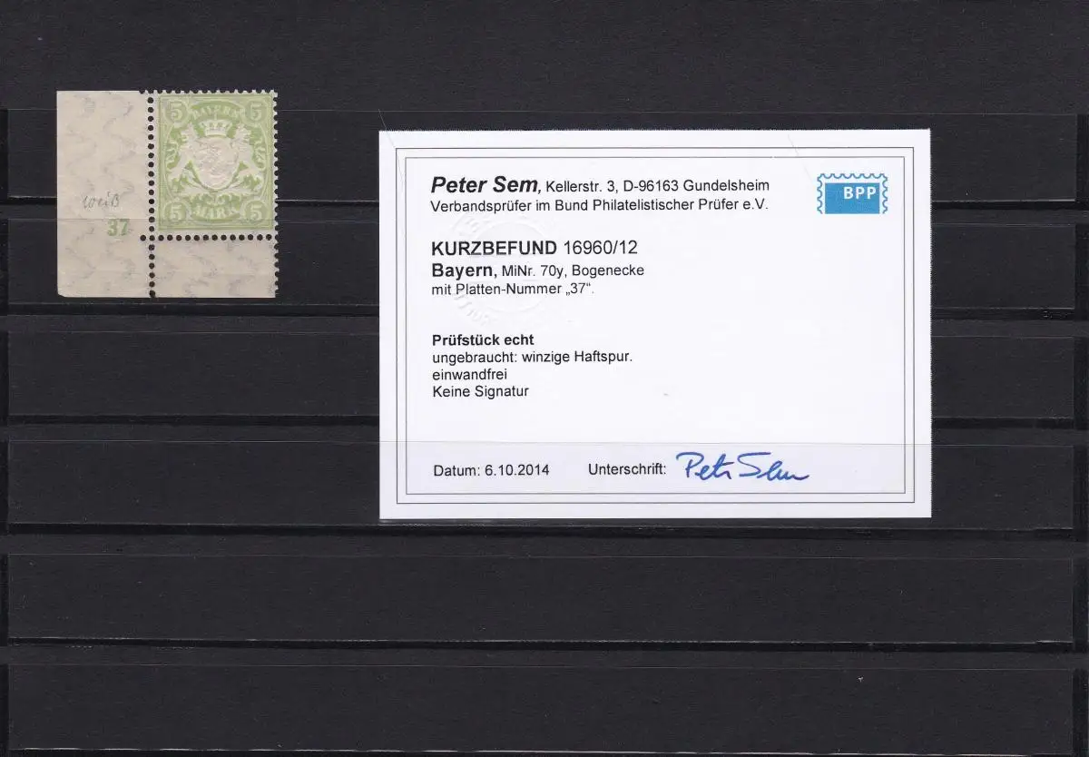 Bavière: MiNr. 70y, arc, plaque numéro, voie d'adhérence, BPP résultat