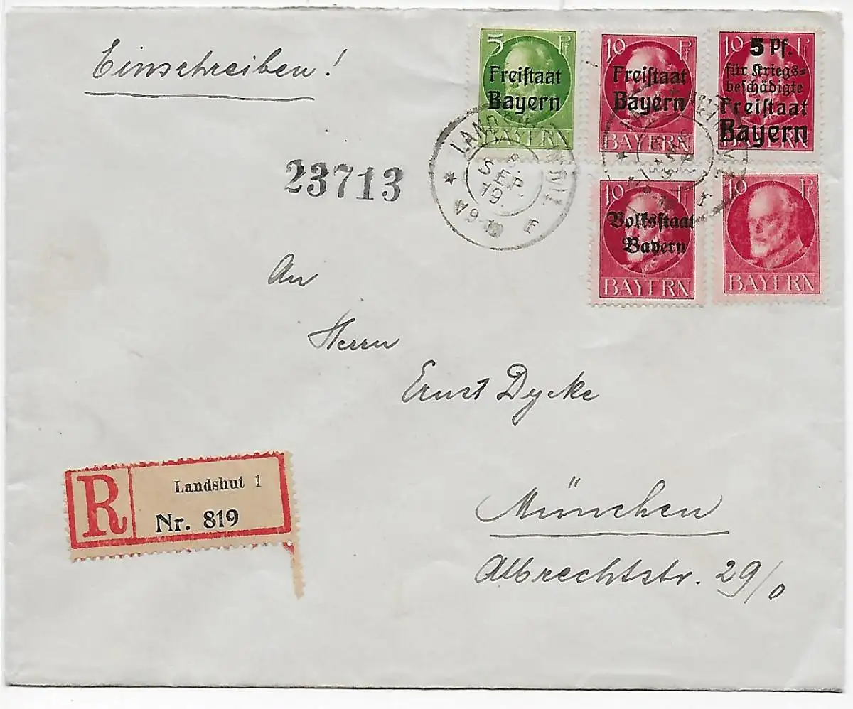 Bavière: lettre recommandée Landshut à Munich, 1919