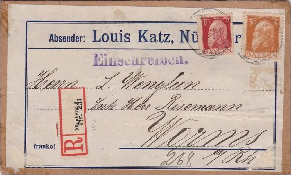 Bavière: section paquet sur carton fixe de Nuremberg à Worms Voir Scan Numéro d'article: Lettres 1328 Vérification: original Numéro de l'élément: 00000000001328