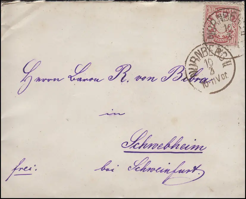 Bayern 10 Pfennig EF Bf. NÜRNBERG II - 8.11. vers Schwebheim SCHWEINFURT 10.3.
