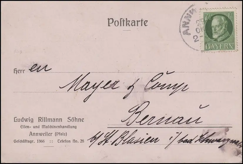 Bayern 113A Ludwig 7 1/2 pf. EF Carte postale ANNWEILER 29.10.17 vers Berne