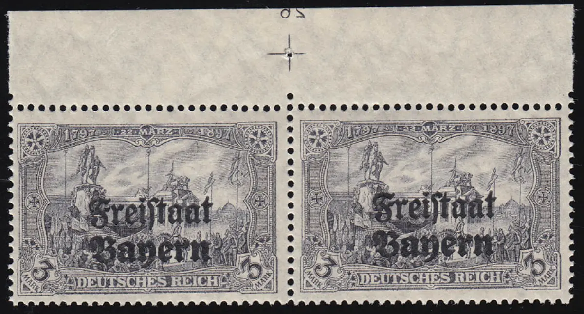 Bayern 150 B Aufdruck 3 Mark Oberrand-Paar mit Plattennummer Pl-Nr. 26, **
