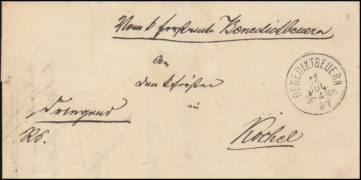 Bavière 1887: Lettre de pli Einkreis BENOÎTBUER 12.7.87 vers KOCHEL 12.07.