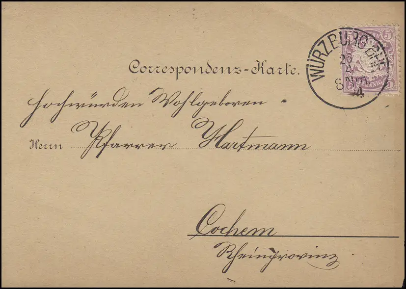 Bayern 5 Pf. Wappen EF Carte postale WÜRZBURG BHF. 26.4.84 vers Cochem