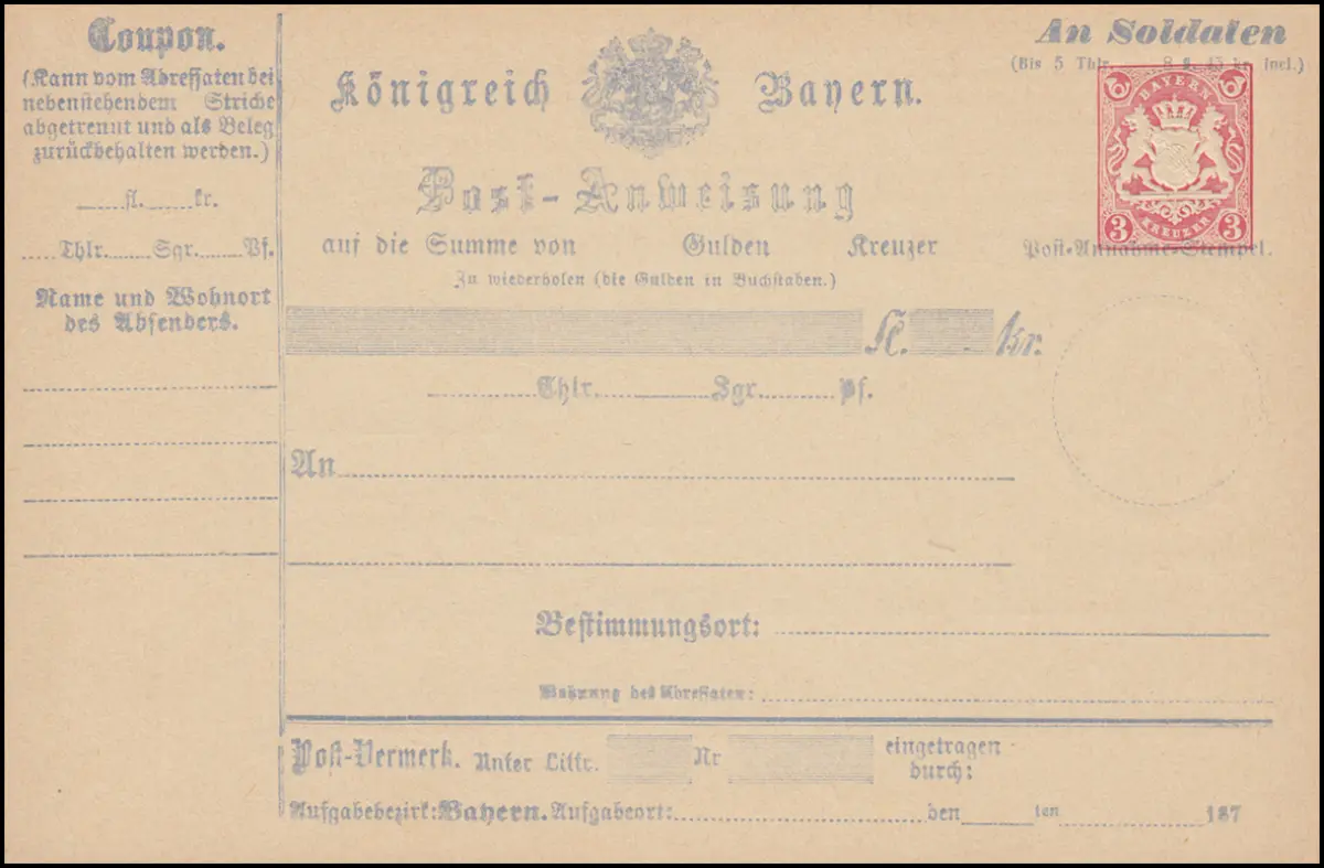 Bayern A 5 I Instruction postale 3 Armoiries de croiseur, avec mention "A des soldats," **