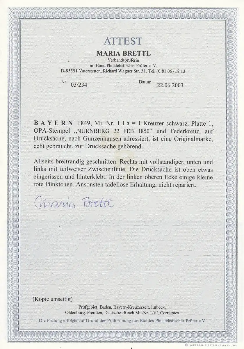 Bayern Mirch. 1 Ia, Platte 1, impression Nuremberg vers Gunzenhausen, sprachrandig