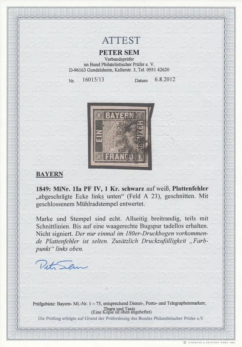 Bayern MiNr. 1 Ia Erreur de plaque IV, tampon de roue de moulin, BPP Attest