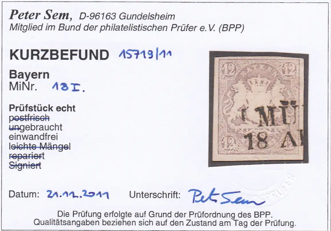 Bavière: MiNr. 18I, cacheté avec BPP