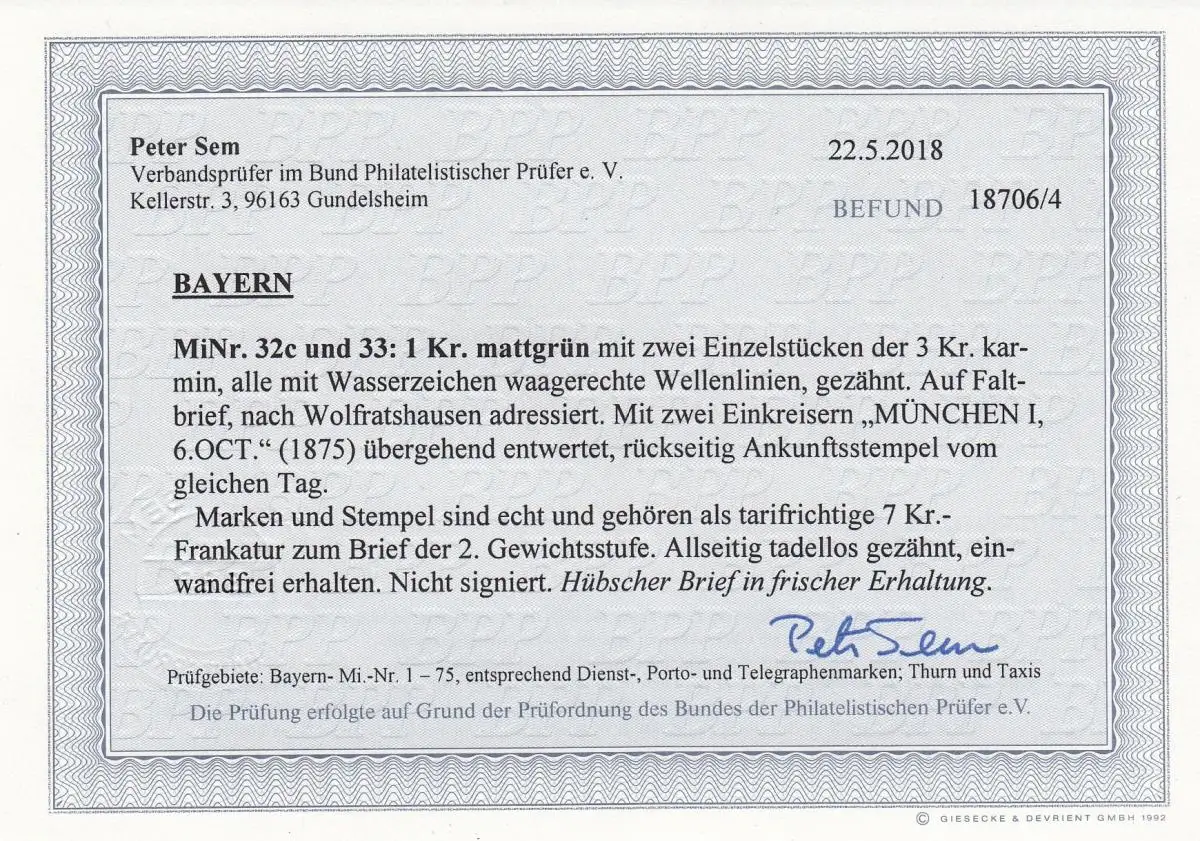 Bavière: MiNr. 32c et 33 sur lettre Munich après Wolfratshausen, BPP résultats