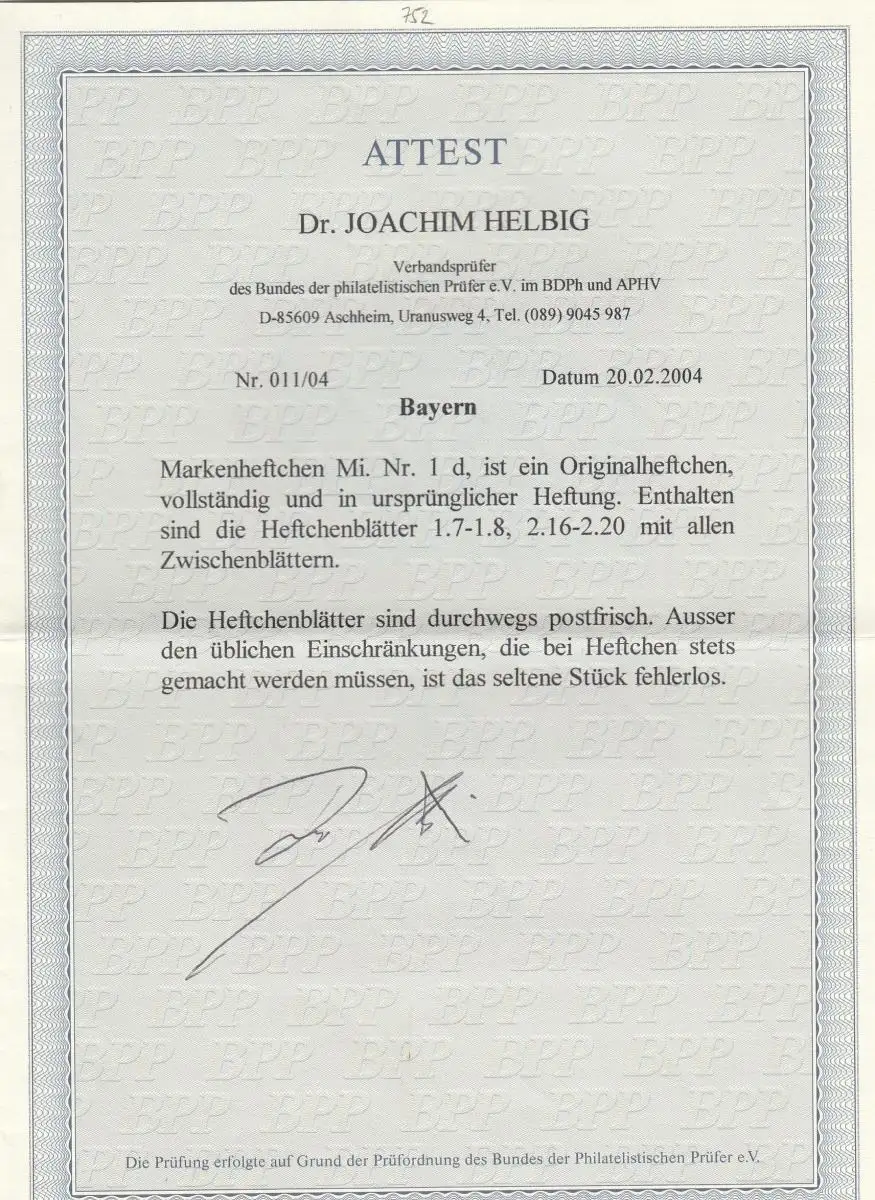 Bavière: MiNr. MH 1 d, post-fraîchissement, BPP Attest