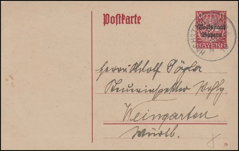 Bayern P 104 Volksstaat 10 Pf DV 19: HÖCHSTEDT / Danube 31.7.19 vers Weingarten