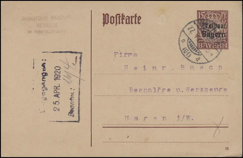 Bayern P 114/01 Freistaat 15 Pf DV 19: BERNECK/Fichtelgebirge 22.4.20 vers Hagen