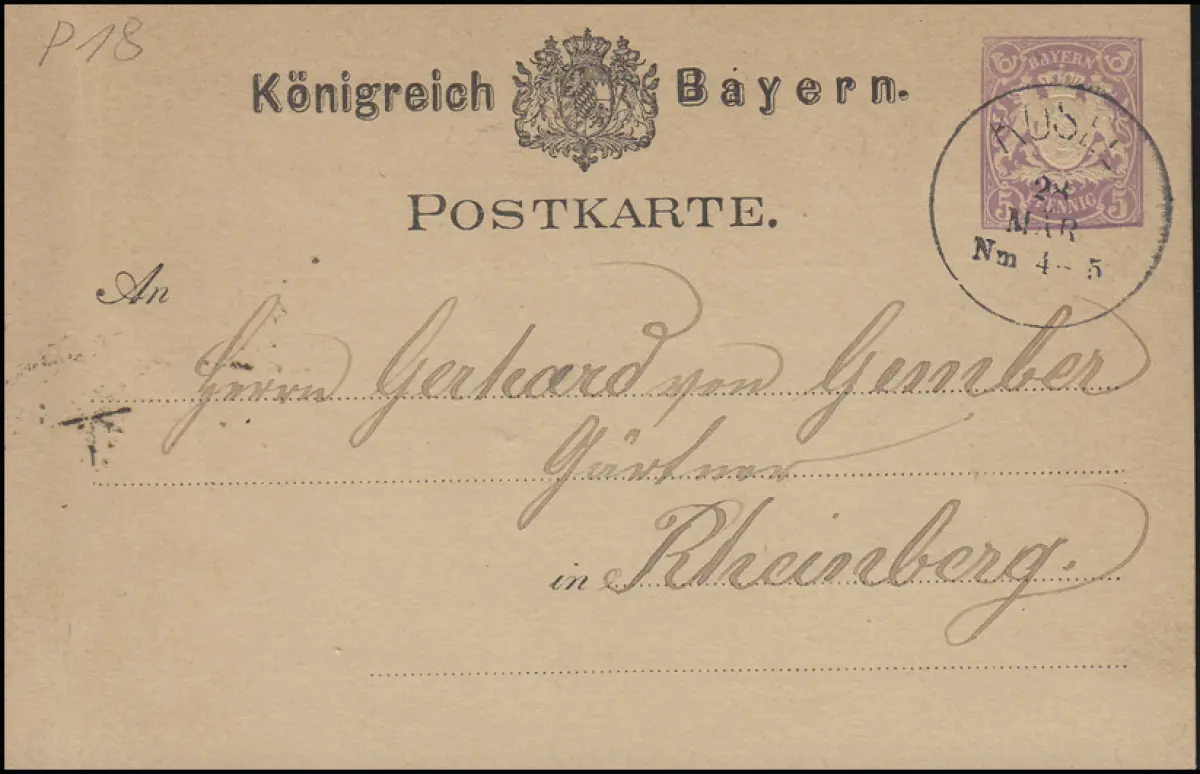 Bayern P 18 Armoiries 5 Pf violet, Gärtnerie Steinmelz KUSEL 28.3.80 vers Rheinberg
