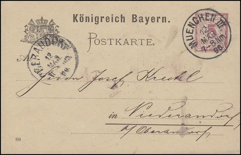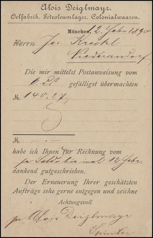 via OBERAUDORF 12.3.90, expéditeur: Alois Deiglmayr - usine pétrolière, entrepôt de pétrole, marchandises coloniales Numéro de catalogue: P34/05 Examen: original Numéro d'article: 00000000003940